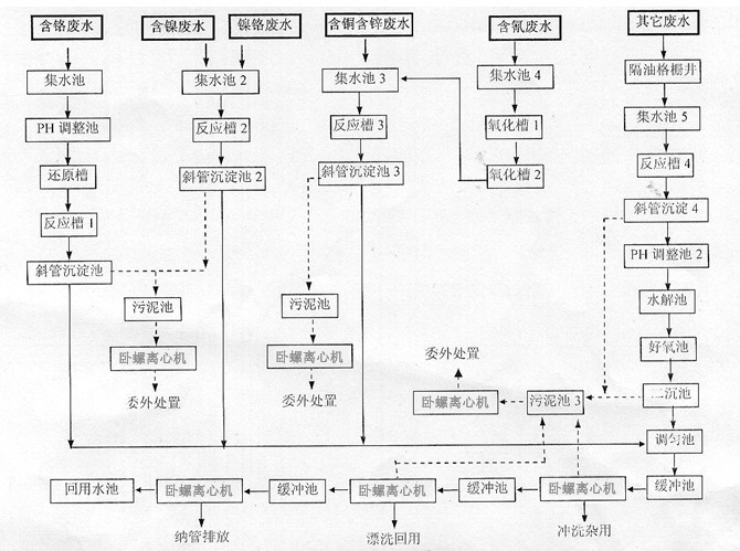 電鍍廢水治理工藝到現(xiàn)在已有很多成熟的工藝了,在廢水治理中為中國環(huán)保作出了很大的貢獻。常規(guī)的工藝是廢水分類治理,如將含氰廢水、六價鉻廢水分開預處理,將含氰廢水中的氰化物氧化、將六價鉻先還原成三價鉻,然后混合處理。這樣的好處在于有鐘對性地進行處理,效果比較好,但由于廢水要分類,最終造成投資增加。在長期和電鍍企業(yè)廢水治理單位的合作中,我們發(fā)現(xiàn)一個非常常見的問題,就是廢水很難分清楚。在實際生產(chǎn)過程中,要把各類廢水分得很清楚是非常困難的。往往是綜合廢水中各種成分的廢水都有,特別是化學鍍工藝廢水中有很多是絡合劑,和重金屬絡合后在水中非常穩(wěn)定。