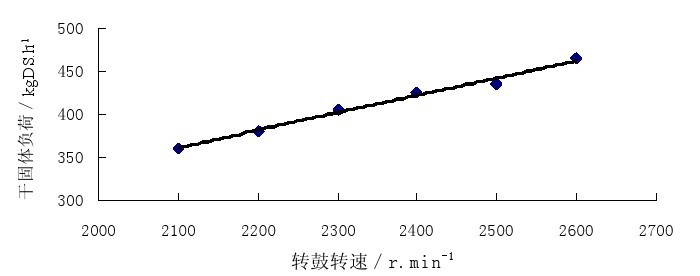所謂干固體負荷是指每小時處理的不揮發(fā)固體重量,以 KgDS(干污泥)/h 表示。調(diào)整離心機的干固體負荷,對污泥脫水效果有很大影響,當(dāng)進泥流量(即“水力負荷”)達到一定程度,所帶入的懸浮物含量超過了離心機所能承受的最大干固體負荷時,會造成泥餅含水率增加,上清液帶泥增多,此時應(yīng)該減少進泥流量,使離心機脫出的上清液清澈在實際運行中,必須通過調(diào)整水力負荷,來保證進入離心機干固體負荷不超過離心機的最大承受能力,否則,多余的干固體將從上清液中排出,上清液的懸浮物會急劇增多,但脫水泥餅的產(chǎn)量并沒有增加。該廠使用的離心機,當(dāng)轉(zhuǎn)鼓轉(zhuǎn)速為 2300rpm、進泥濃度為 35 g/L 時,離心機運行的干固體負荷可達 405kg/h。當(dāng)離心機磚鼓轉(zhuǎn)速增加時,干固體負荷也會相應(yīng)增加,圖 3 是最大干固體負荷隨離心機轉(zhuǎn)鼓轉(zhuǎn)速變化的曲線。