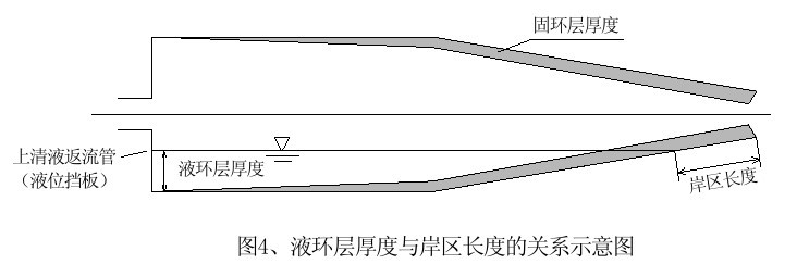 當(dāng)進泥量一定時,如果液環(huán)層厚度較大,污泥在離心機內(nèi)的停留時間長,污泥在液環(huán)層內(nèi)進行分離的時間越長,會有更多的污泥被分離出來,并能夠降低某些小顆粒受擾動而隨分離液流失的可能性,但液環(huán)層厚度過大,會造成水隨脫水后的污泥從污泥出口溢出;如果離心機內(nèi)的液環(huán)層厚度較小,污泥在離心機內(nèi)的停留時間短,工作壓力不容易提高,但脫水后的污泥含水率也較低。綜合以上兩方面的作用,液環(huán)層增厚一般會提高脫水的固體回收率,但液環(huán)層增厚,相應(yīng)會使岸區(qū)縮短,如上圖所示,使脫離液環(huán)層的污泥沒有充足的時間被甩干,因此泥餅含固率將下降。在控制液環(huán)層厚度時間應(yīng)