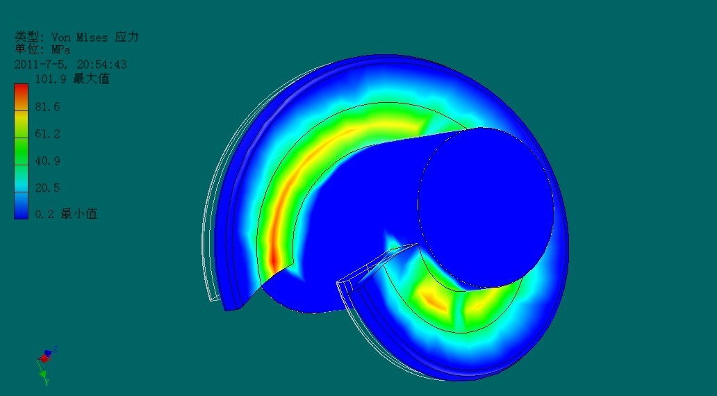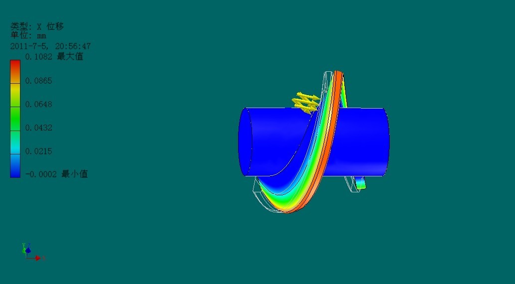 下面我們通過對螺旋葉片施加一定的載荷,來反映在工作狀態(tài)下螺旋葉片最大應(yīng)力和變形發(fā)生的位置。下面我們從ANSYS有限元分析的結(jié)論圖中選定:Von Mises 應(yīng)力(Von Mises 應(yīng)力是基于剪切應(yīng)變能的一種等效應(yīng)力,其含義是單元體形狀比能達到一定的程度)和X方向上的位移這兩幅分析圖,既可以清楚反映葉片的根部應(yīng)力值最大的問題,同時從位移圖中可以看出葉片外端部所受的位移變化之最大。