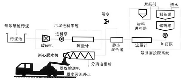 我公司制造的污泥脫水成套設備的工藝流程圖如下(主要由六大部分組成):